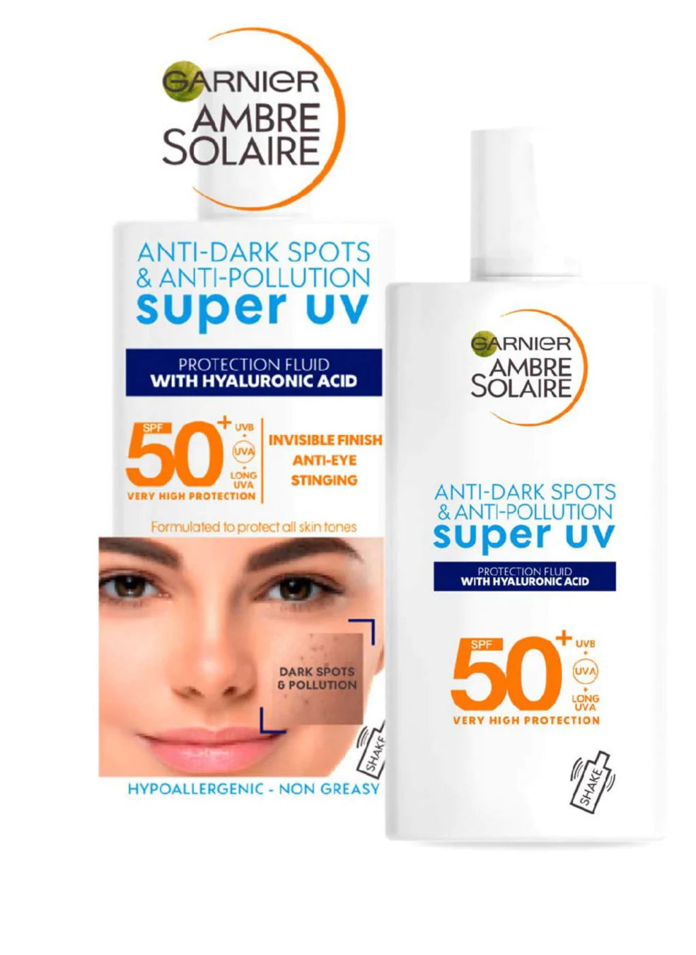 Garnier Ambre Solaire Anti-Dark Spots & Anti-Pollution Super UV Protection Fluid is enriched with hyaluronic acid and vitamin E. The formula offers very high SPF protection to help prevent sun induced dark spots, while protecting skin from pollution induced oxidative stress. Its ultra-light texture is absorbed instantly and offers daily hydration without leaving a greasy finish on skin. No residue. Non-comedogenic. Suitable for daily use.