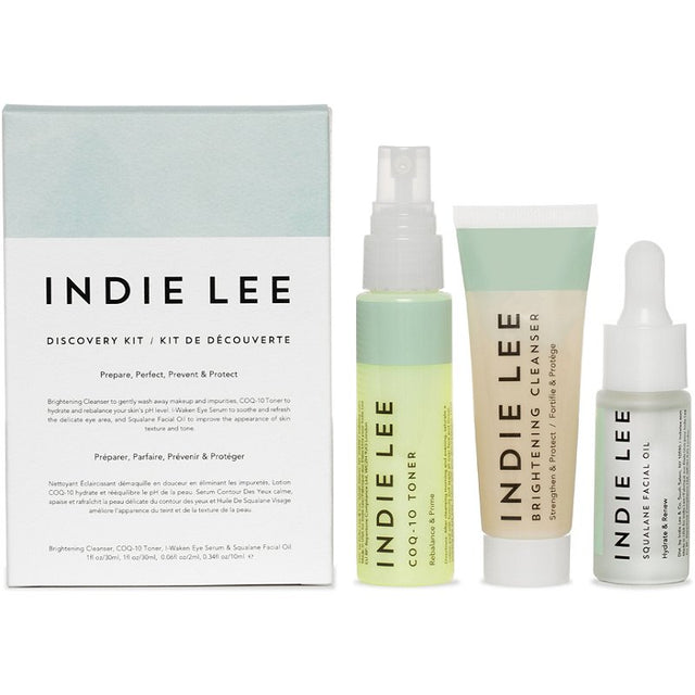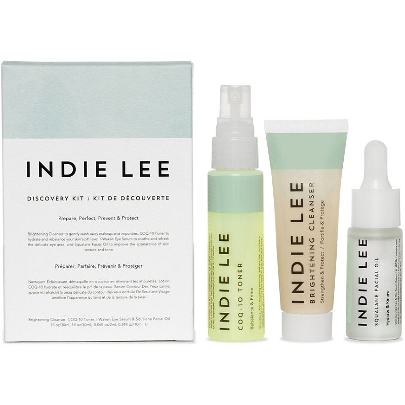 Indie Lee Discovery Kit is excellent for travel or to discover Indie Lee. This 3-pc kit contains Brightening Cleanser to gently wash away makeup and impurities, COQ-10 Toner to hydrate and protect against environmental stressors and Squalane Facial Oil to promote moisture retention and help diminish the appearance of fine lines.