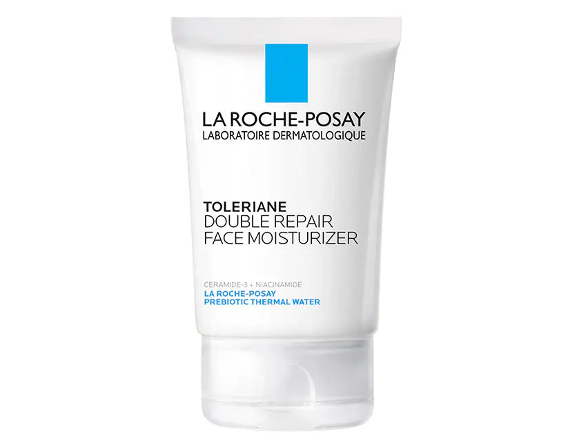 La Roche-Posay Toleriane Double Repair Face Moisturizer for sensitive skin with niacinamide provides 48-hour hydration and prebiotic benefits for the skin barrier.