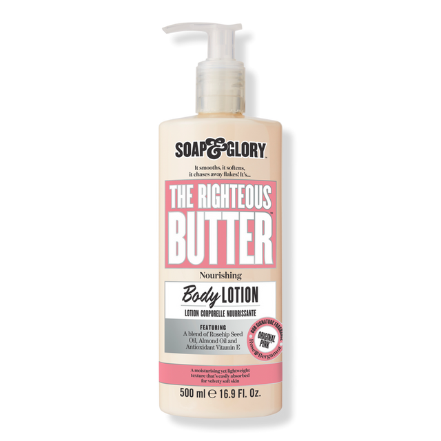 Moisturize, hydrate and feel spectacularly softer skin with Soap & Glory Original Pink The Righteous Butter Moisturizing Body Lotion. This lightweight, non-greasy lotion has nourishing ingredients that lock in moisture, and it smells like a dream with the iconic Soap & Glory Original Pink fragrance.